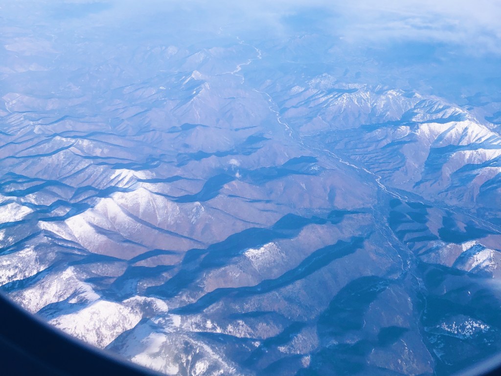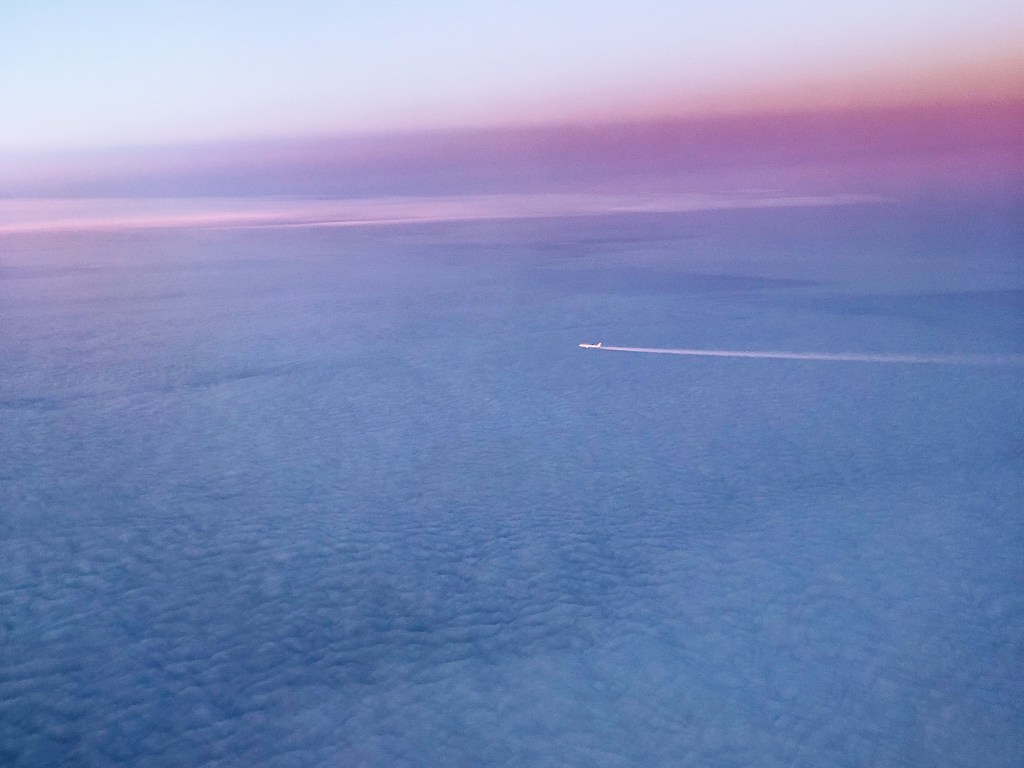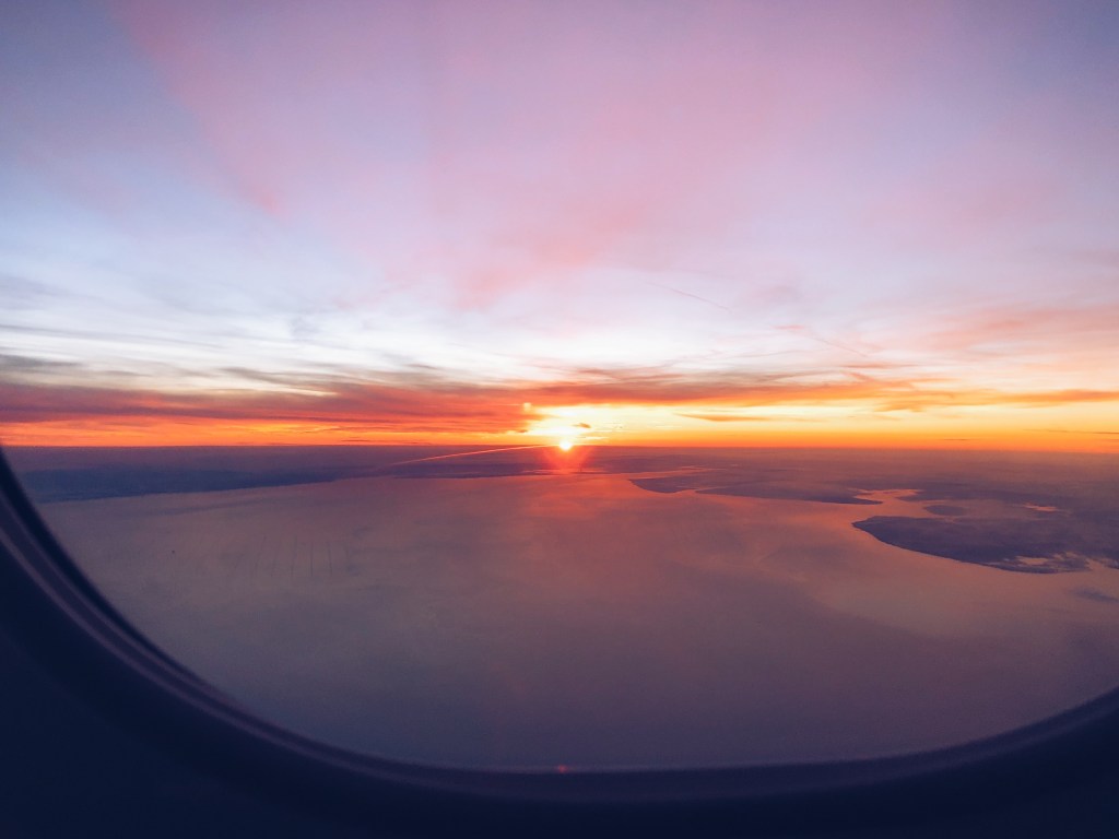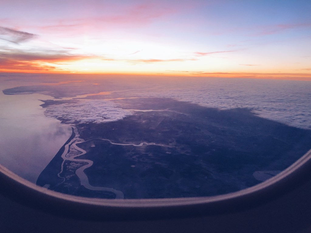 The plane headed into the sunset, which was, again, so beautiful. As we got closer to the UK, I saw grey clouds neatly covering the cities; that’s why English cities are so dark in the winter. But I discovered that the sky above the clouds was very bright and clear.