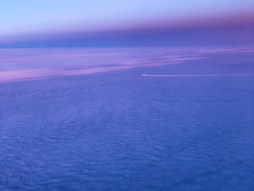 The plane was heading toward the sunrise in Europe, so the sky was gradually turning to apricot and violet colours – the clock was turning back. It was really beautiful.