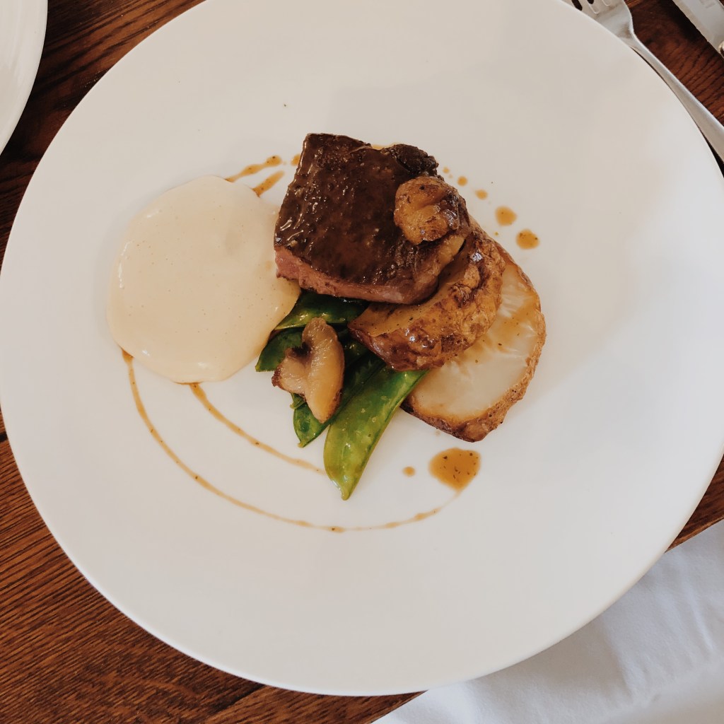 Starting with some Prosecco and beautifully decorated petit fours, I had a two-course meal: Norfolk Dumplings and Ex Fen Farm Dairy Cow Aged Sirloin.