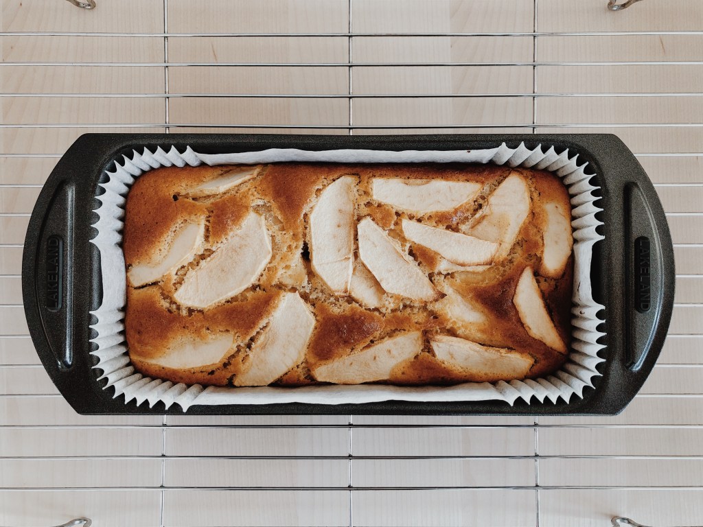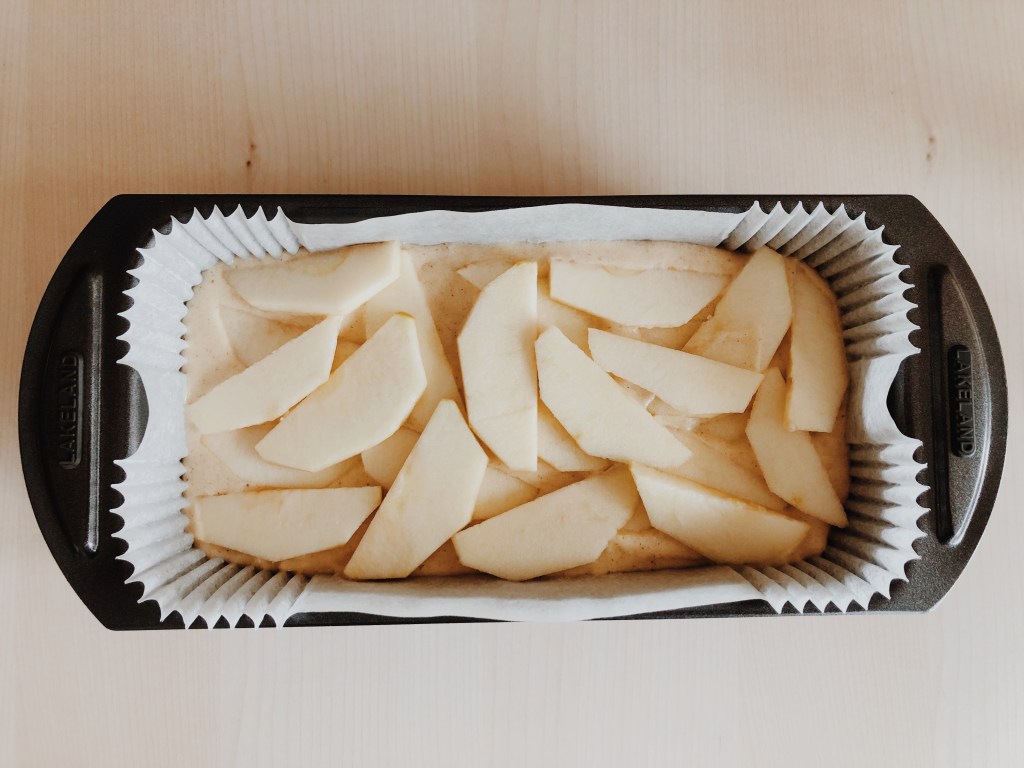 - Pour the mixture into the prepared loaf tin and arrange the saved apple slices on the top. Bake in the preheated oven for 40–50 minutes.