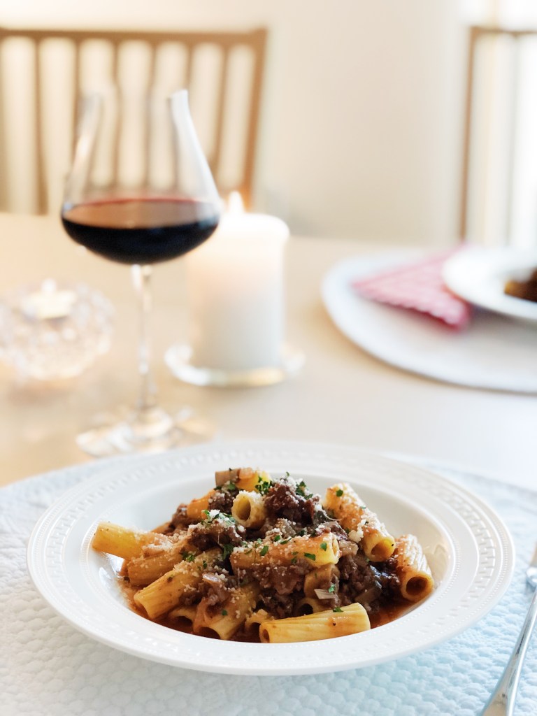 My recipe is not exactly authentic Italian bolognese, but it’s easy to prepare and cook, and homemade sauce is always the best! Allow 15 minutes for the prep and 30 minutes for cooking. I serve this red wine bolognese with rigatoni or tagliatelle, and it also goes well with mashed potatoes.
