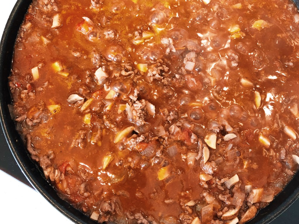 - Add the minced beef and Italian herbs, and cook stirring for 4 minutes until browned. Add red wine, and bring it to a gentle sizzle for two minutes.