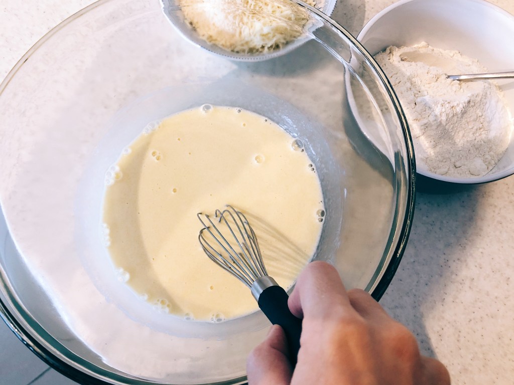 - Whisk the egg in a large bowl and stir in the milk, yoghurt and olive oil.