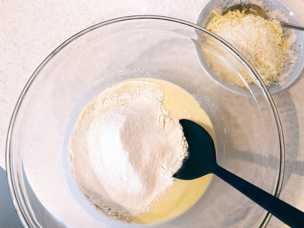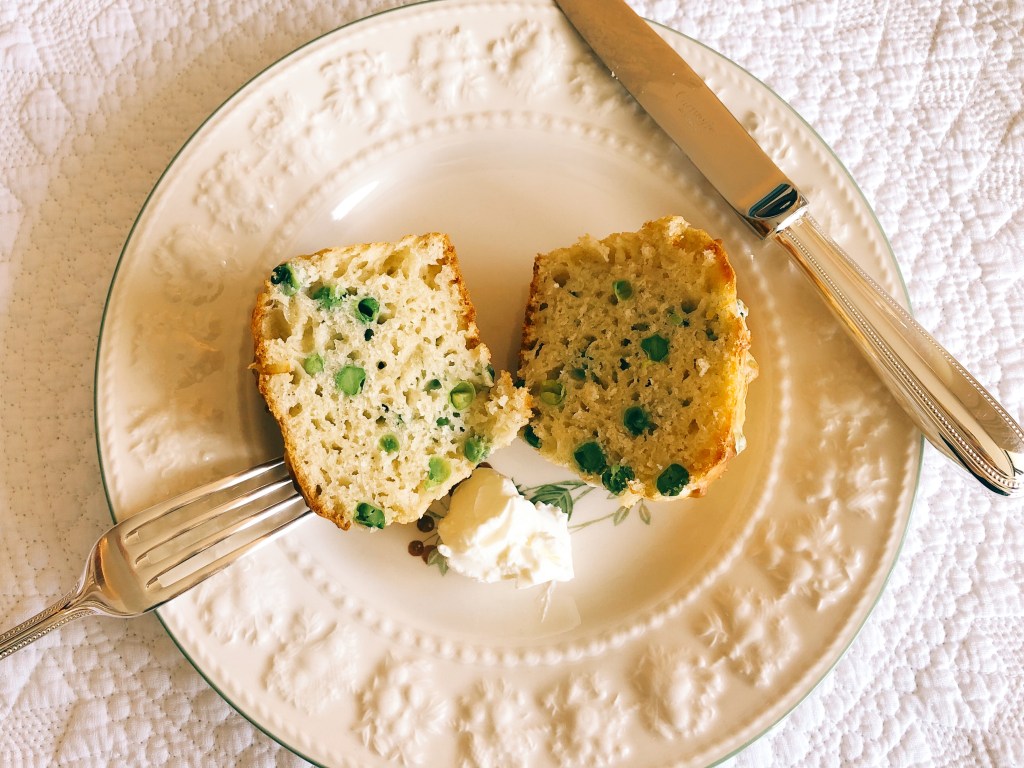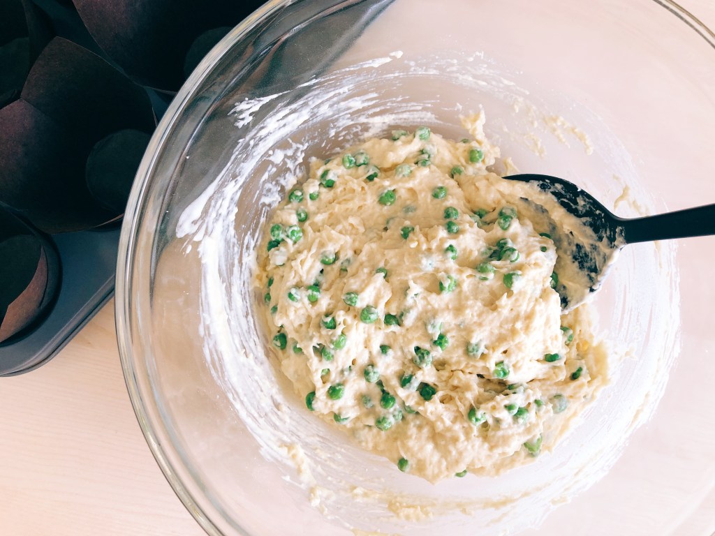 I’ve been testing my muffin recipe for the past few years by adjusting the ingredients, and I now feel confident that my recipe gives a consistently good result. I always use petit pois and tend to mix different kinds of cheese (mostly cheddar and Swiss cheese). The method is very simple, and the advantage is that the batter comes together in one bowl.