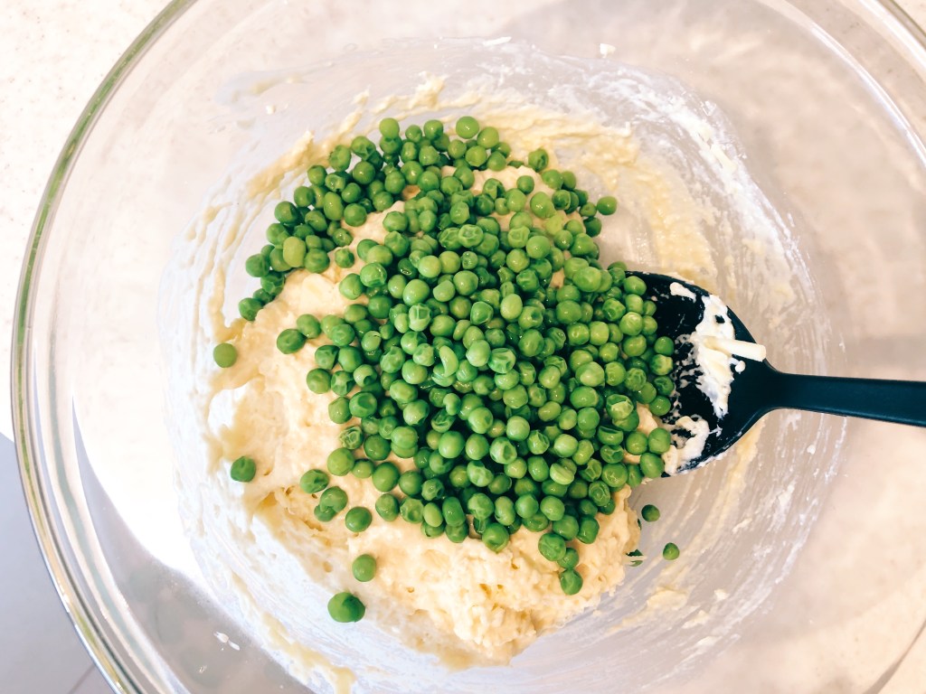 - When the mixture is smooth, blend in the cheese, salt and drained peas. Distribute the batter into the prepared muffin tin, so that each hole is 2/3 full.