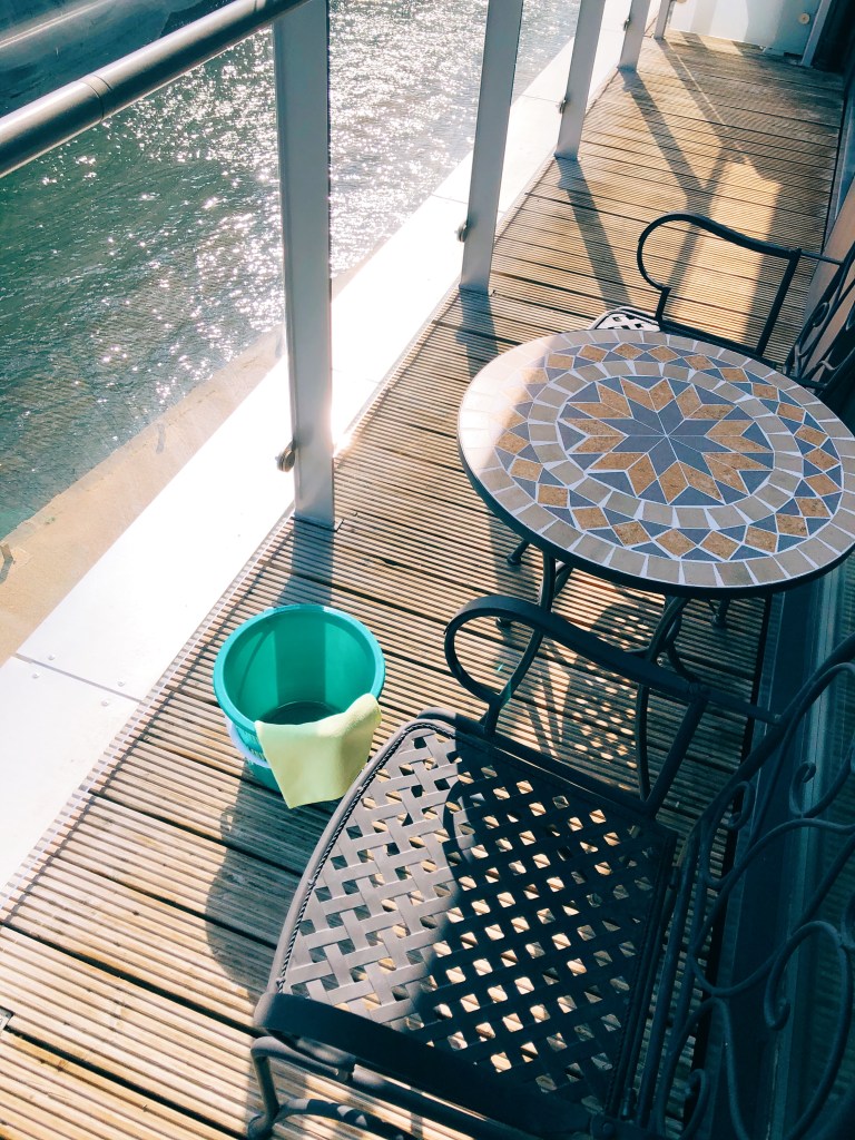 Last weekend, Luca and I thoroughly cleaned the floor, window glass, handrail and furniture on the balcony. It’s a very small, cosy space, so the clean-up was finished in two days after a broom, a short-handled brush, cleaning cloth and cleaner arrived.