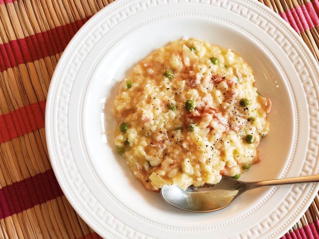 Single cream is the key to creaminess. I add Parmesan and stir for a minute right before serving. Then, I usually sprinkle freshly ground black pepper on the top of the risotto. Another variation of my favourite is a garnish of chopped parsley and soured cream on top.